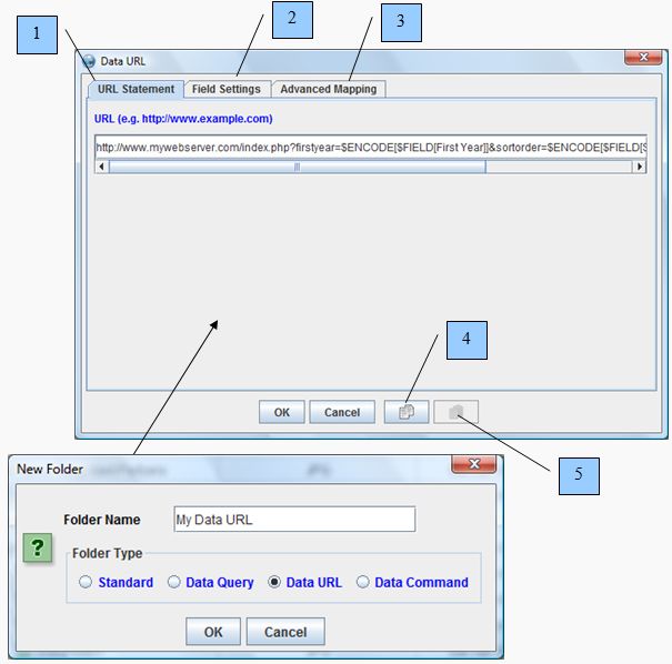How to define folder Data URL settingsWith the Data URL dialog you can define settings for retrieving information from a URL utilizing standard URL syntax. Custom search forms for input can also be enabled by including custom syntax within the URL statement. To access the Data URL dialog create a new folder with Data URL toggled on. Then select Data URL from the Folder Popup context menu. URL connections are only available with the Elite version of this application.