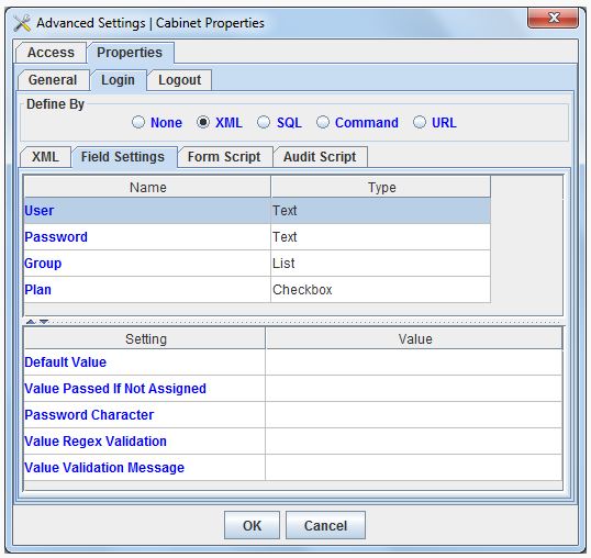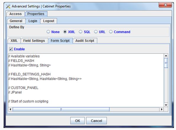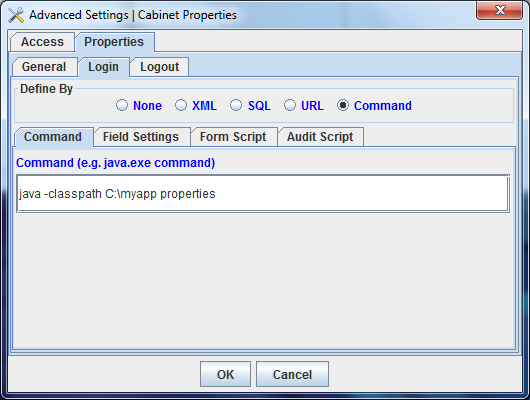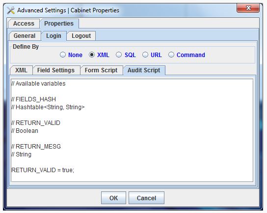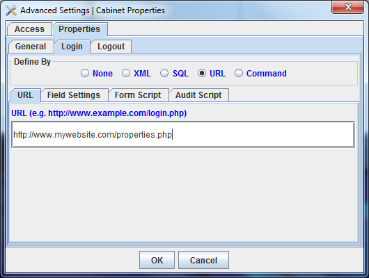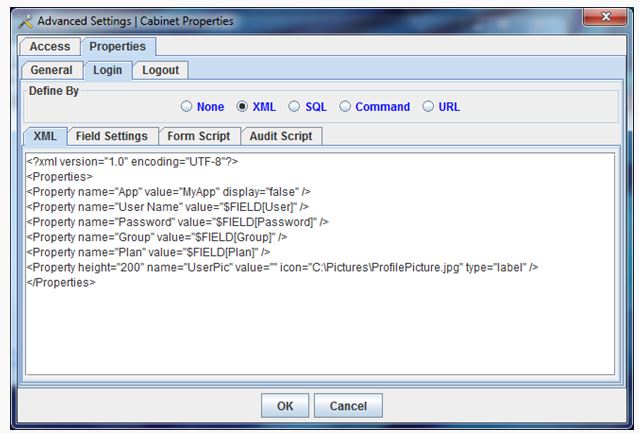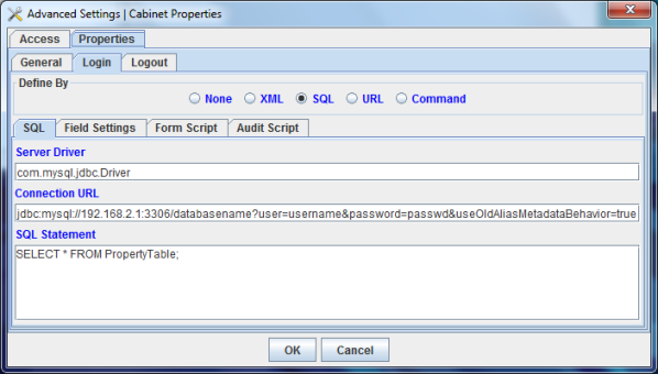 - The Login property settings tab is where you can define the XML for the cabinet properties, or the external source to retrieve the XML properties from, such as an SQL Query from a database, a URL web service, or a command line application.