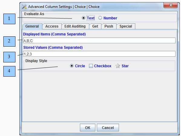 - 1) Utilize the Text and Number toggle to define the type of data the Choice field will represent for its Stored Values.