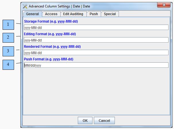 - 2) Utilize the Editing Format field to specify the Java date formatting pattern that is required upon editing the column value. The above example, yyyy-MM-dd format specifies that the column value attribute must be edited as 2015-01-25 for example, for the year, month, and day delimitted by dashes. This field setting must be defined.
