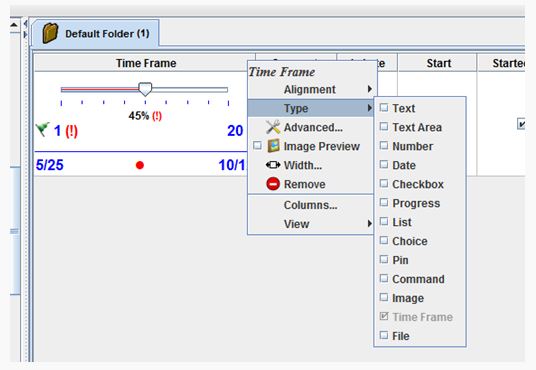 - How to set a folder's column data type as a Time Frame. Time Frame columns can be utilized to graphically represent several elements of a gantt task.